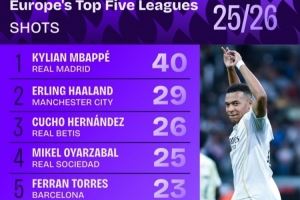 体育资讯10月17日讯 Squawka统计了本赛季到目前为止欧洲五大联赛球员射门次数排行,皇马前锋姆巴佩40次射门排名第一,哈兰德29次第二。